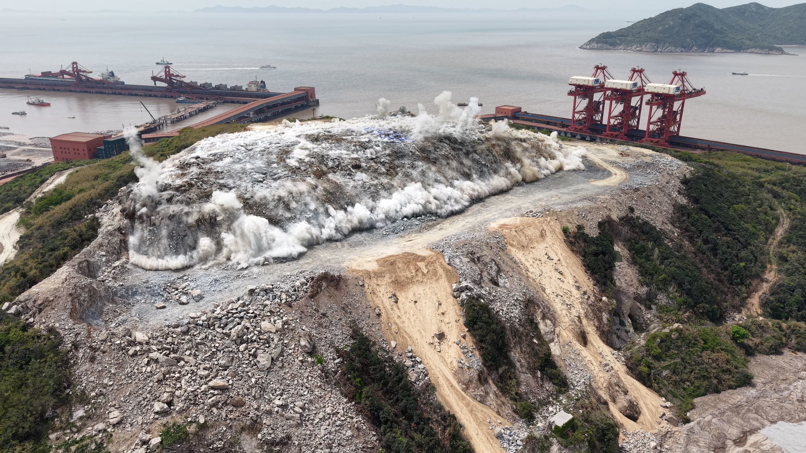 头岗山项目地处离岸小岛,开挖量83.70万立方,开挖高度从+107.8 m至+58 m,开挖区三面紧邻全球唯一双40万吨离岛作业自动化散货码头以及变电所等极重要设施,周边环境极其复杂。在项目方案论证会上,谢院士高度重视,提出建设性意见,爆破次数由原计划40多次锐减至4次,全程采用大区钻孔爆破设计施工方案,极大减少了40万吨离岛作业自动化散货码头作业船舶撤离次数,做到了变电所不停电、重要设施正常运行。同时还对爆破有害效应进行了充分论证,消除了业主单位的疑虑。