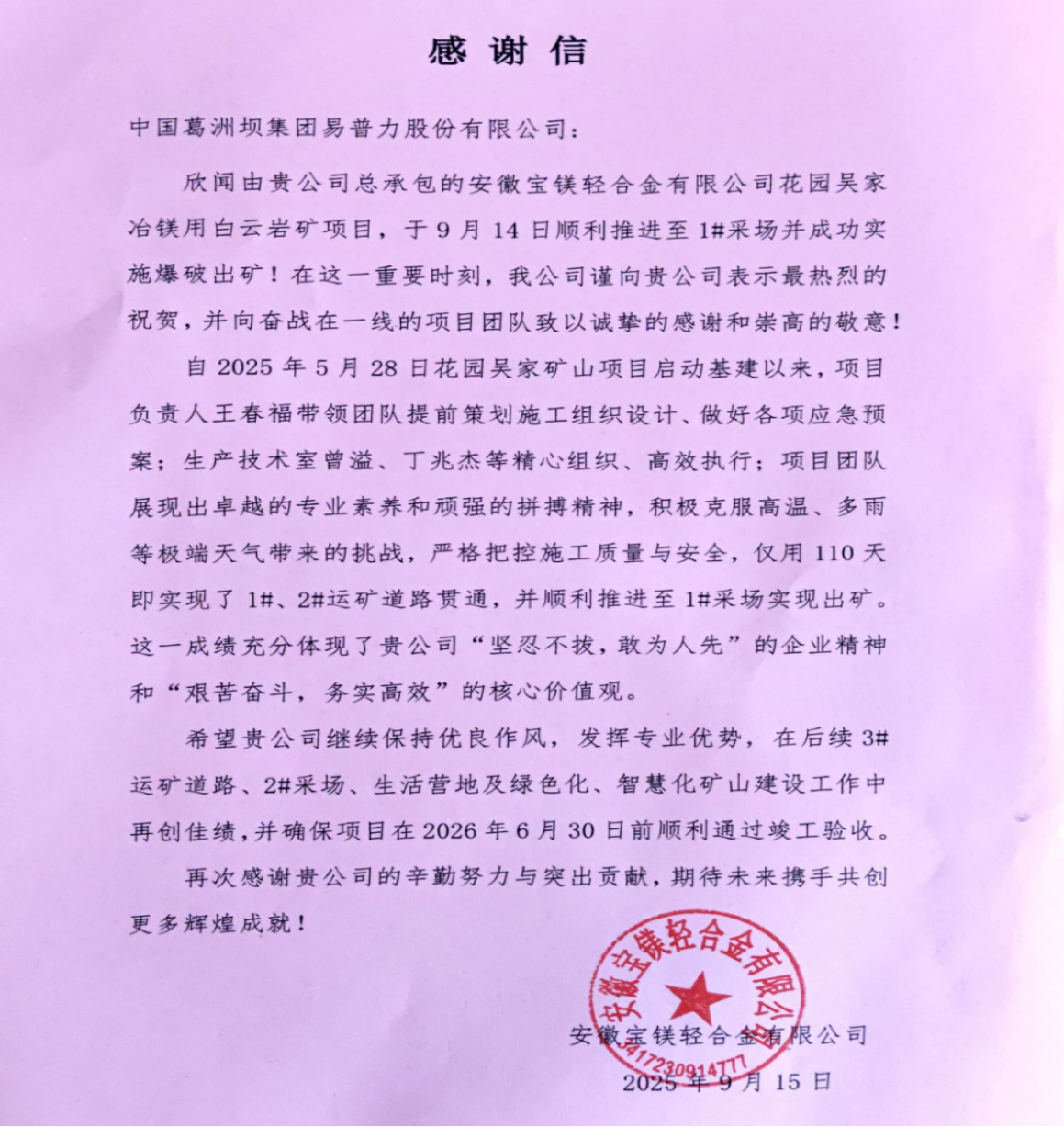 9月15日,中国能建易普力公司池州分公司(以下简称池州分公司)收到业主单位安徽宝镁轻合金有限公司发来的感谢信,信中对分公司在2025年安徽宝镁花园吴家冶镁项目基建期内高效推动1#采场顺利实现出矿的出色表现给予高度肯定与诚挚感谢。